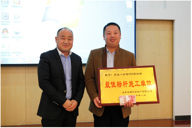 會上,公司副總經(jīng)理、質(zhì)量檢查組組長班磊以PPT的形式,結(jié)合各項(xiàng)目日常表現(xiàn)總結(jié)分析了2015年度工程檢查中各項(xiàng)目體現(xiàn)的亮點(diǎn)和不足。并對表現(xiàn)突出的金泰華府南地塊27#樓承建單位天元102項(xiàng)目部進(jìn)行了表彰。